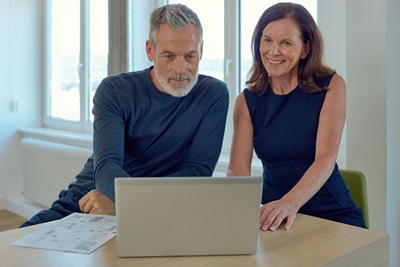 Two professionals analyzing data on a computer screen in an office setting